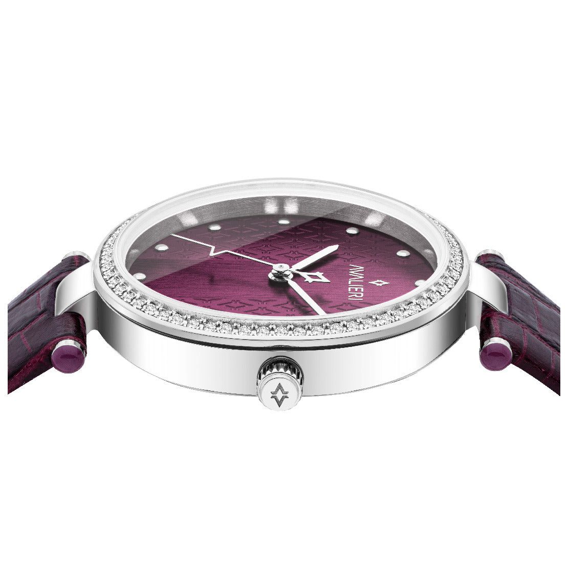 تتميز هذه الساعة من أفالييري بلونها الأرجواني وسوارها الجلدي الفاخر، وهيكلها المصنوع من الفولاذ المقاوم للصدأ بقطر 32 مم وسماكة 7.8 مم، وهي محمية بطبقة من الزجاج المعدني المتين وحركة كوارتز موثوقة. تتمتع الساعة بمقاومة للماء حتى عمق 30 مترًا. الموديل: WAI0106-006 (Giusi)