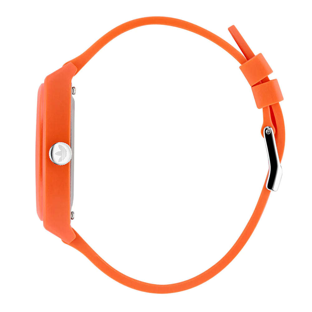 This orange Adidas watch features a high-quality resin bracelet and a 38mm resin case, measuring 38mm and 10mm thick, protected by a layer of strong acrylic glass and a reliable quartz movement. The watch is water resistant to 50 meters. meter