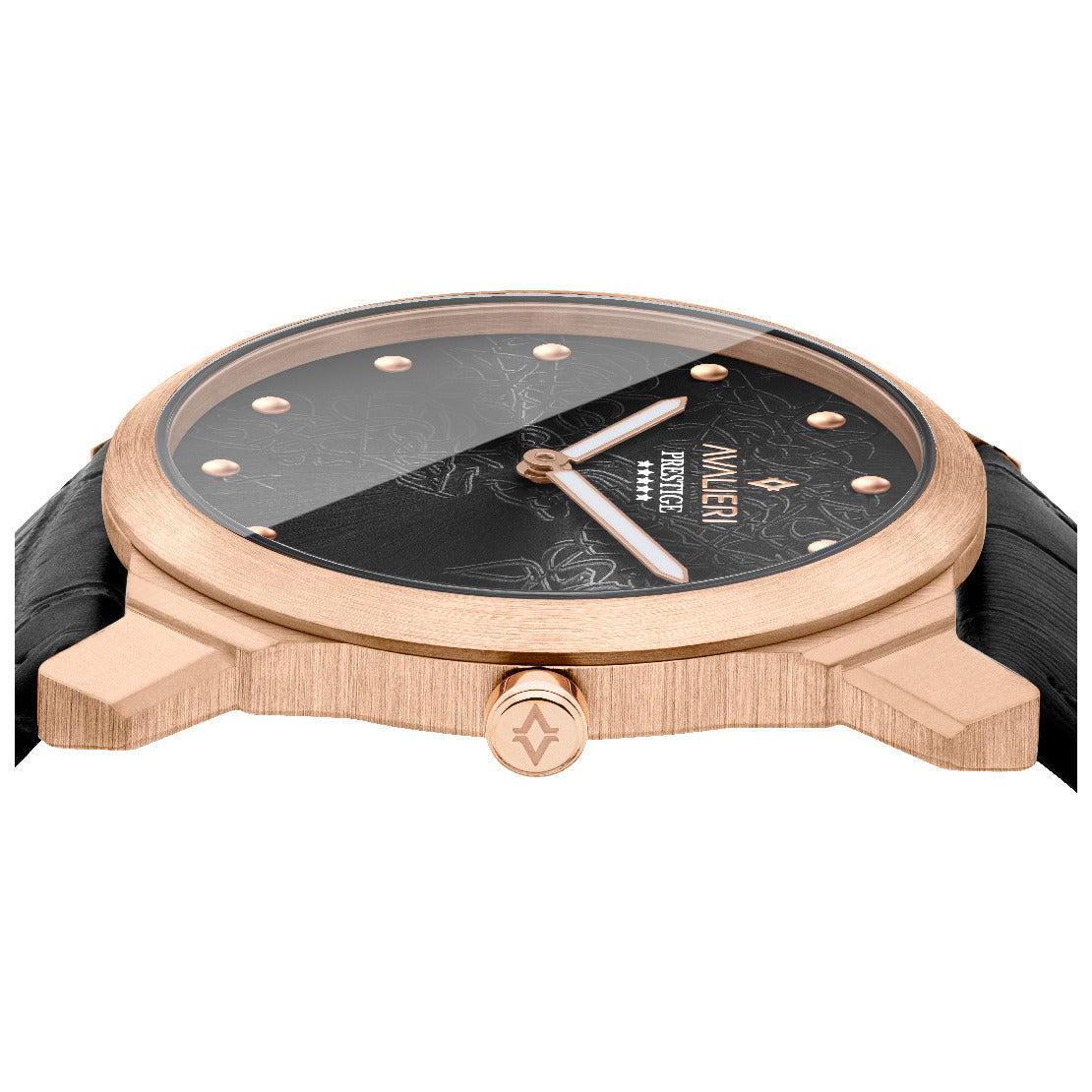 This watch from Avalieri Prestige features a black color, a high-quality leather strap, a stainless steel case measuring 40 mm and a thickness of 6.75 mm, protected by a layer of strong mineral glass, and a reliable quartz movement. The watch has a water resistance of 50 meters.
