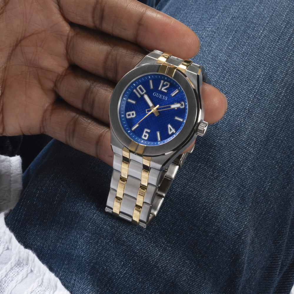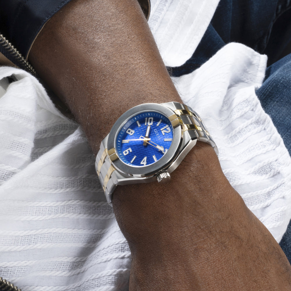 This watch from Guess features a silver and gold color with a high-quality stainless steel bracelet and a 44 mm stainless steel case protected by a layer of strong mineral glass and a reliable quartz movement. The watch has a water resistance of up to 50 meters.