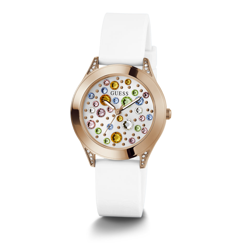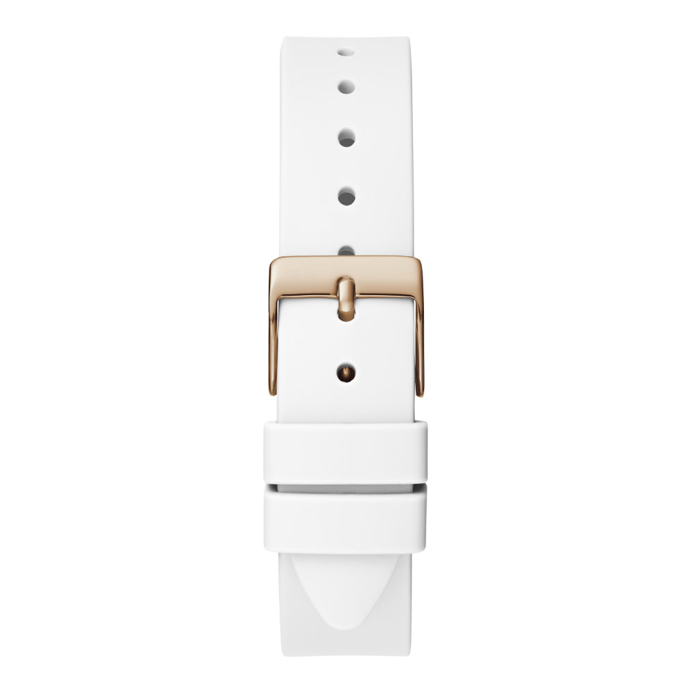 This watch from Guess features a white color and a high-quality silicone bracelet and a case made of recycled steel measuring 34 mm, protected by a layer of strong mineral glass and a reliable quartz movement. The watch has a water resistance of up to 30 meters.