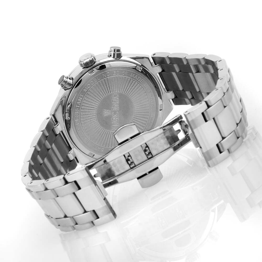 This Marc Enzo watch features a silver color and a high-quality stainless steel bracelet and a stainless steel case measuring 41 mm and 10.7 mm thick. It is protected by a layer of strong mineral glass and a reliable quartz movement. The watch is water resistant. Up to 50 metres