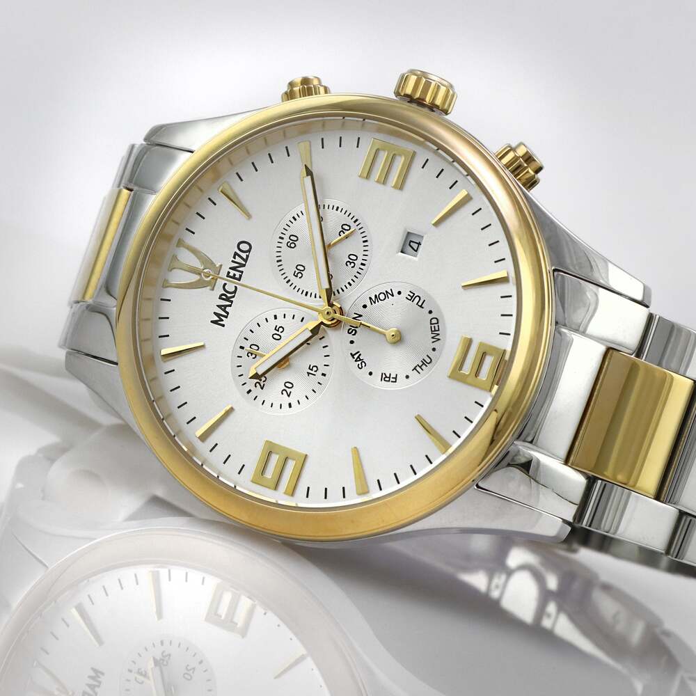 This Marc Enzo watch features a silver and gold color with a high-quality stainless steel bracelet and a stainless steel case measuring 41 mm and 10.7 mm thick. It is protected by a layer of strong mineral glass and a reliable quartz movement. The watch is resistant to Water up to 50 metres