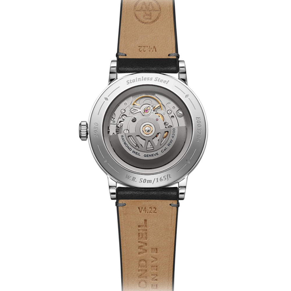 This Raymond Weil watch features a black color with a high-quality leather strap and a stainless steel case measuring 39.5 mm and 9.25 mm thick. It is protected by a layer of strong sapphire glass and has a reliable automatic movement. The watch has a water resistance of up to 50 meters.