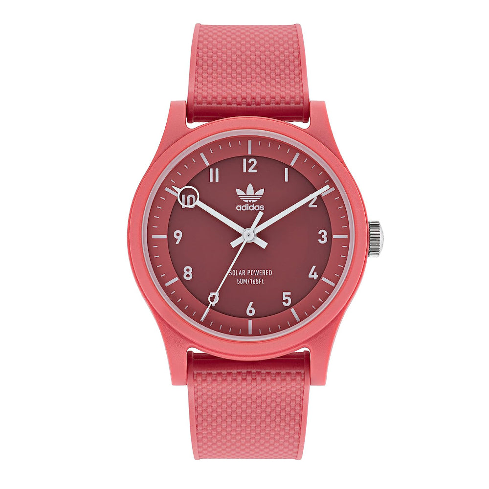 تتميز هذه الساعة من أديداس باللون الوردي وبسوار ذات جودة عالية مصنوعة من الريزن (مادة صمغية/الراتنج) وهيكل مصنوع من البلاستيك معاد تدويره من المحيطات بمقاس 39ملم وبسمك 8ملم محمي بطبقة من الزجاج المعدني القوي وبحركة تعمل بالطاقة الشمسية الموثوقة ولدى الساعة مقاومة ضد الماء حتى 50 متر