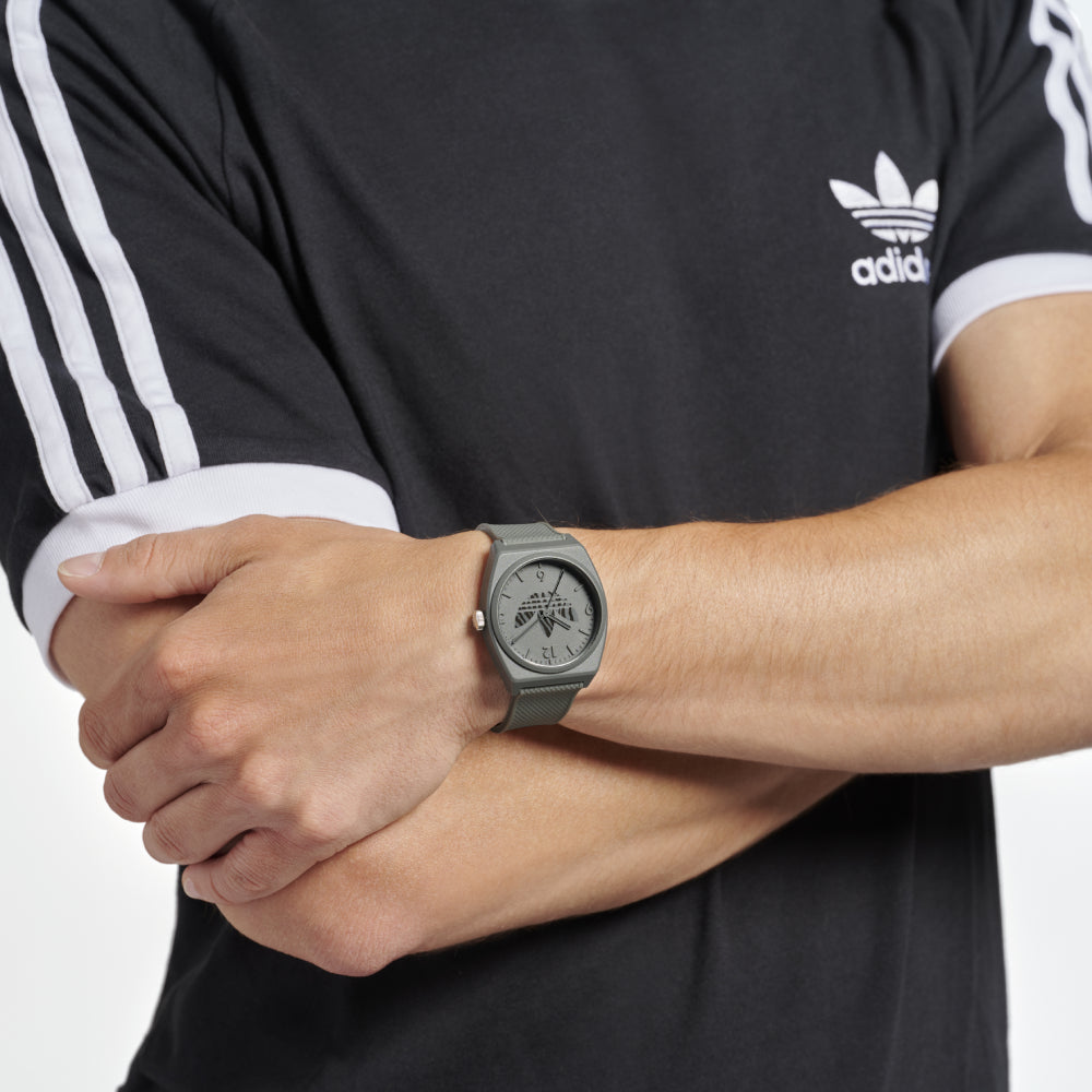 تتميز هذه الساعة من أديداس باللون الرمادي وبسوار ذات جودة عالية مصنوعة من الريزن (مادة صمغية/الراتنج) وهيكل مصنوع من الريزن (مادة صمغية/الراتنج) بمقاس 38ملم وبسمك 10ملم محمي بطبقة من الزجاج الأكريليك القوي وبحركة كوارتز الموثوقة ولدى الساعة مقاومة ضد الماء حتى 50 متر