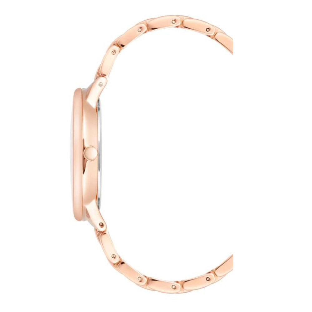 تتميز هذه الساعة من آن كلاين باللون الذهبي وردي (روز جولد) وبسوار ذات جودة عالية مصنوعة من الفولاذ وهيكل مصنوع من النيكل بمقاس 32ملم وبسمك 9ملم محمي بطبقة من الزجاج المعدني القوي وبحركة كوارتز الموثوقة ولدى الساعة مقاومة ضد الماء حتى 30 متر