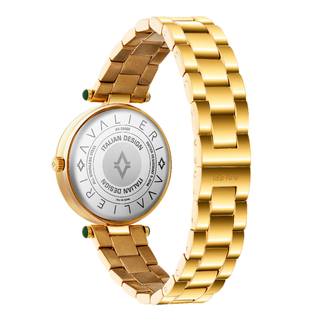 تتميز هذه الساعة من أفاليري باللون الذهبي وبسوار ذات جودة عالية مصنوعة من الفولاذ المقاوم للصدأ (ستانلس ستيل) وهيكل مصنوع من الفولاذ المقاوم للصدأ (ستانلس ستيل) بمقاس 32ملم وبسمك 7.8ملم محمي بطبقة من الزجاج المعدني القوي وبحركة كوارتز الموثوقة ولدى الساعة مقاومة ضد الماء حتى 30 متر