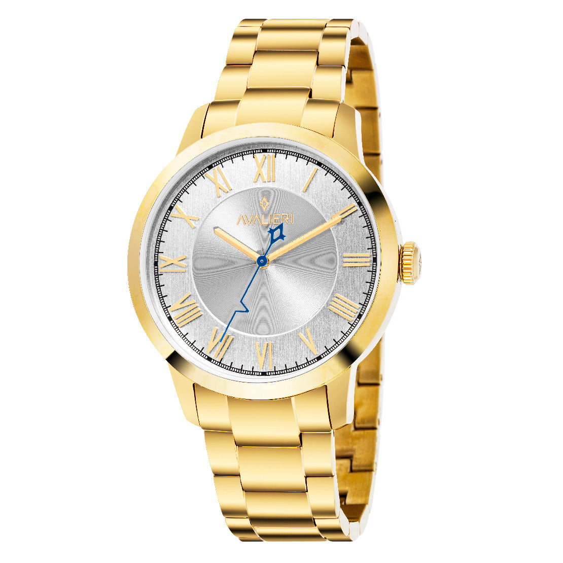تتميز هذه الساعة من أفاليري باللون الذهبي وبسوار ذات جودة عالية مصنوعة من الفولاذ المقاوم للصدأ (ستانلس ستيل) وهيكل مصنوع من الفولاذ المقاوم للصدأ (ستانلس ستيل) بمقاس 41ملم وبسمك 8.9ملم محمي بطبقة من الزجاج المعدني القوي وبحركة كوارتز الموثوقة ولدى الساعة مقاومة ضد الماء حتى 50 متر
