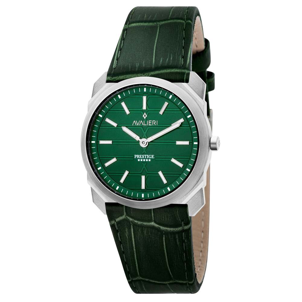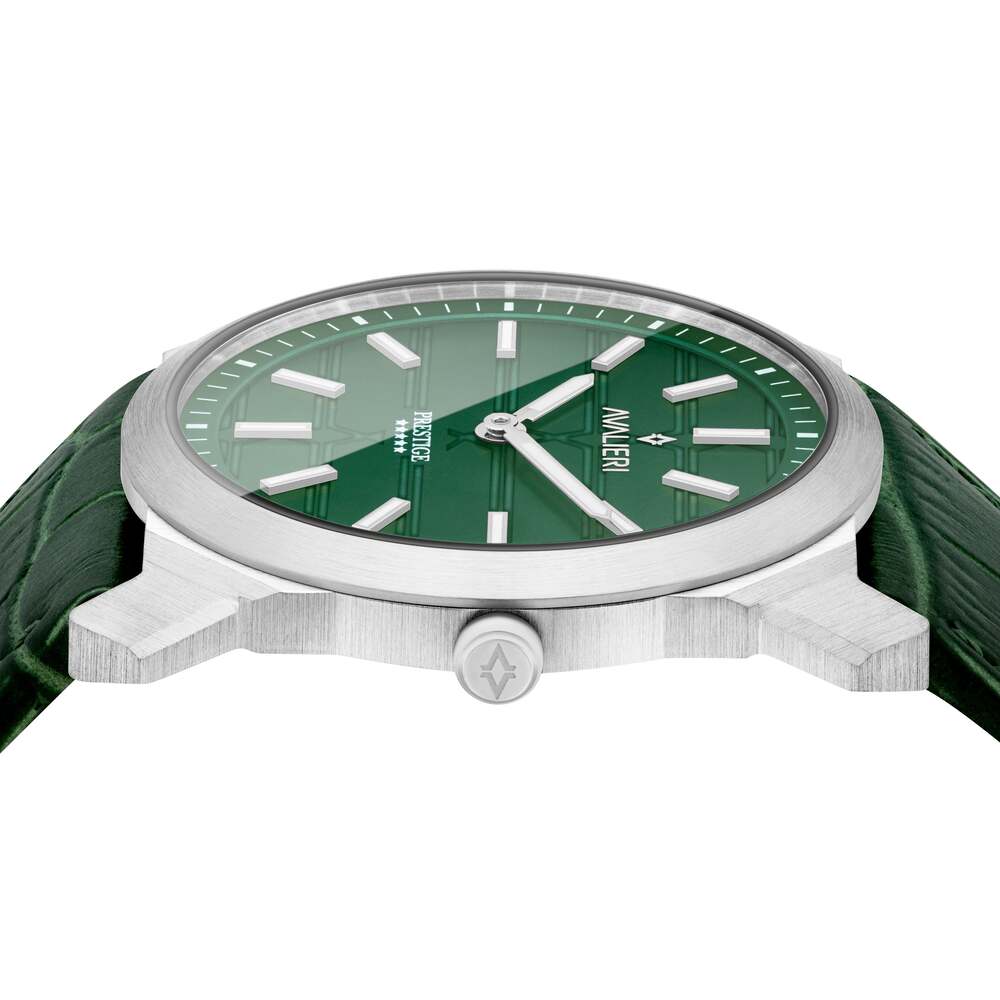 تتميز هذه الساعة من أفاليري برستيج باللون الأخضر وبسوار ذات جودة عالية مصنوعة من الجلد وهيكل مصنوع من الفولاذ المقاوم للصدأ (ستانلس ستيل) بمقاس 40ملم وبسمك 6.75ملم محمي بطبقة من الزجاج المعدني القوي وبحركة كوارتز الموثوقة ولدى الساعة مقاومة ضد الماء حتى 50 متر