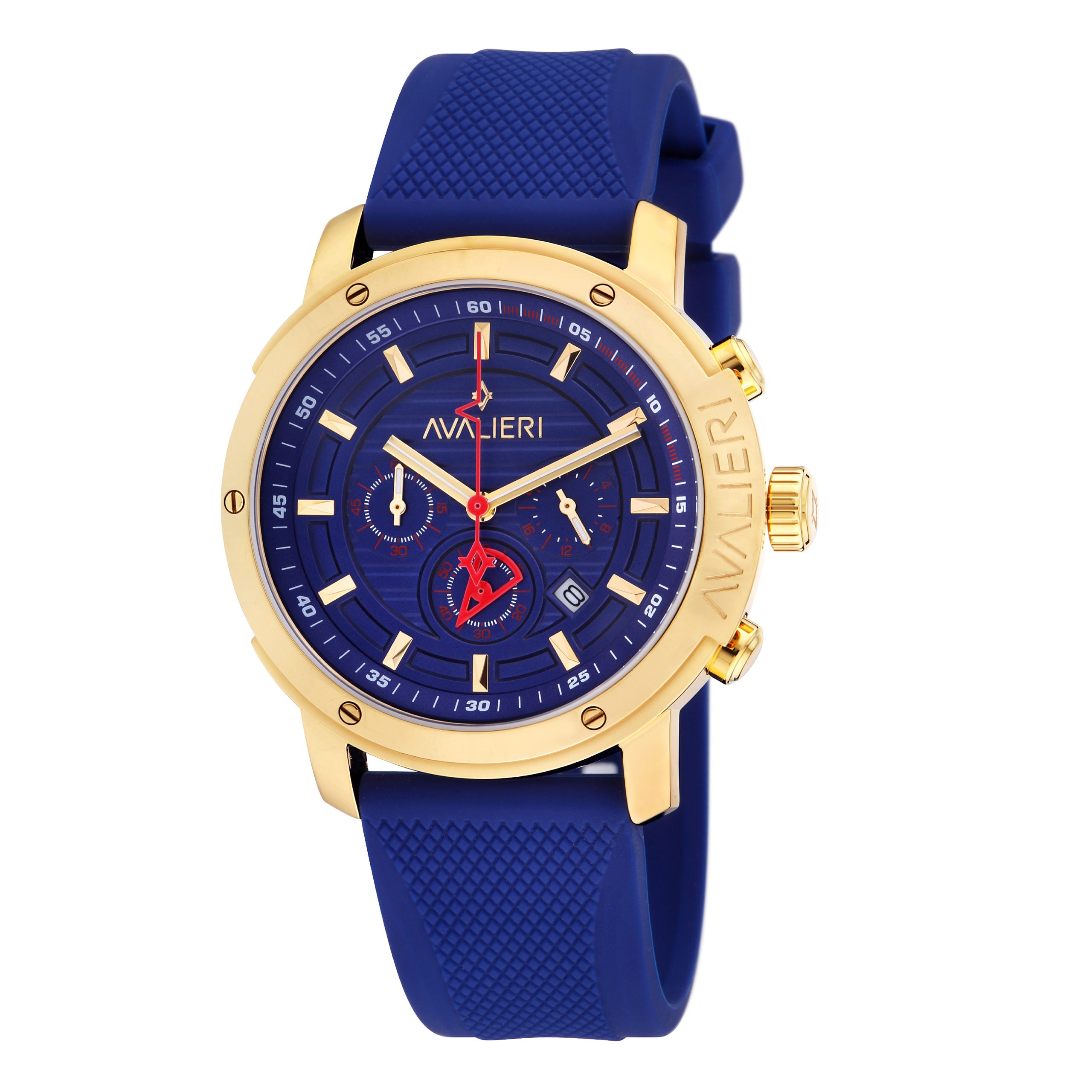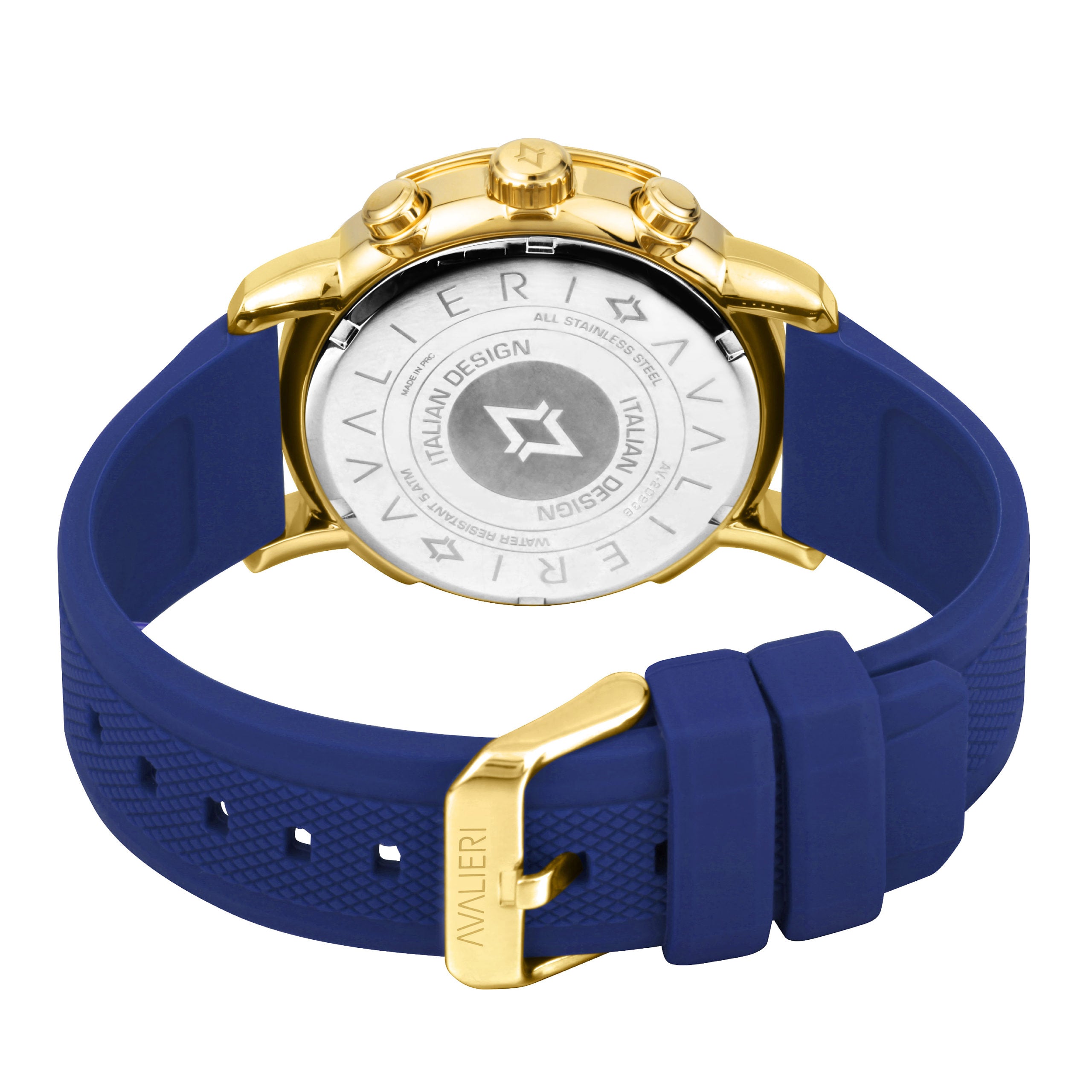 تتميز هذه الساعة من أفاليري باللون الأزرق وبسوار ذات جودة عالية مصنوعة من السيليكون وهيكل مصنوع من الفولاذ المقاوم للصدأ (ستانلس ستيل) بمقاس 44ملم محمي بطبقة من الزجاج المعدني القوي وبحركة كوارتز الموثوقة