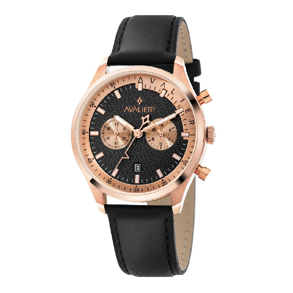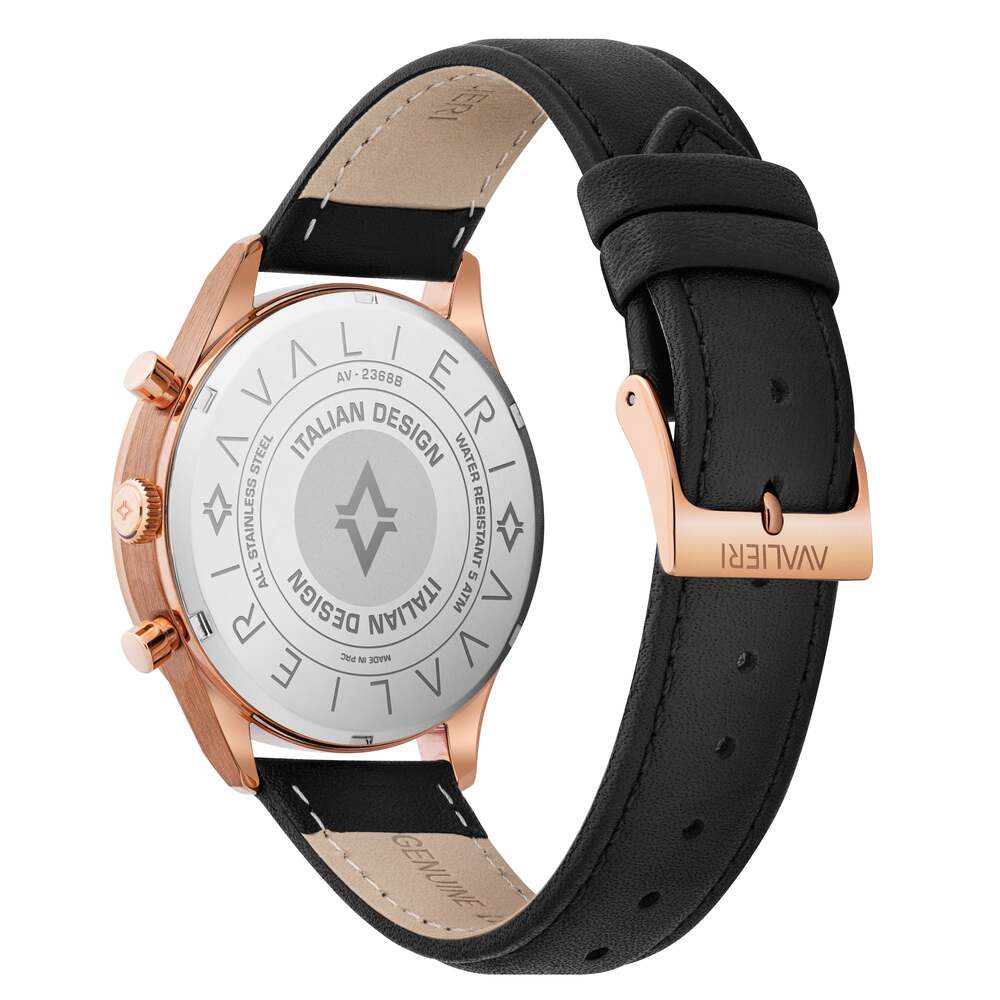 تتميز هذه الساعة من أفاليري باللون الأسود وبسوار ذات جودة عالية مصنوعة من الجلد وهيكل مصنوع من الفولاذ المقاوم للصدأ (ستانلس ستيل) بمقاس 40ملم محمي بطبقة من الزجاج المعدني القوي وبحركة كوارتز الموثوقة ولدى الساعة مقاومة ضد الماء حتى 30 متر