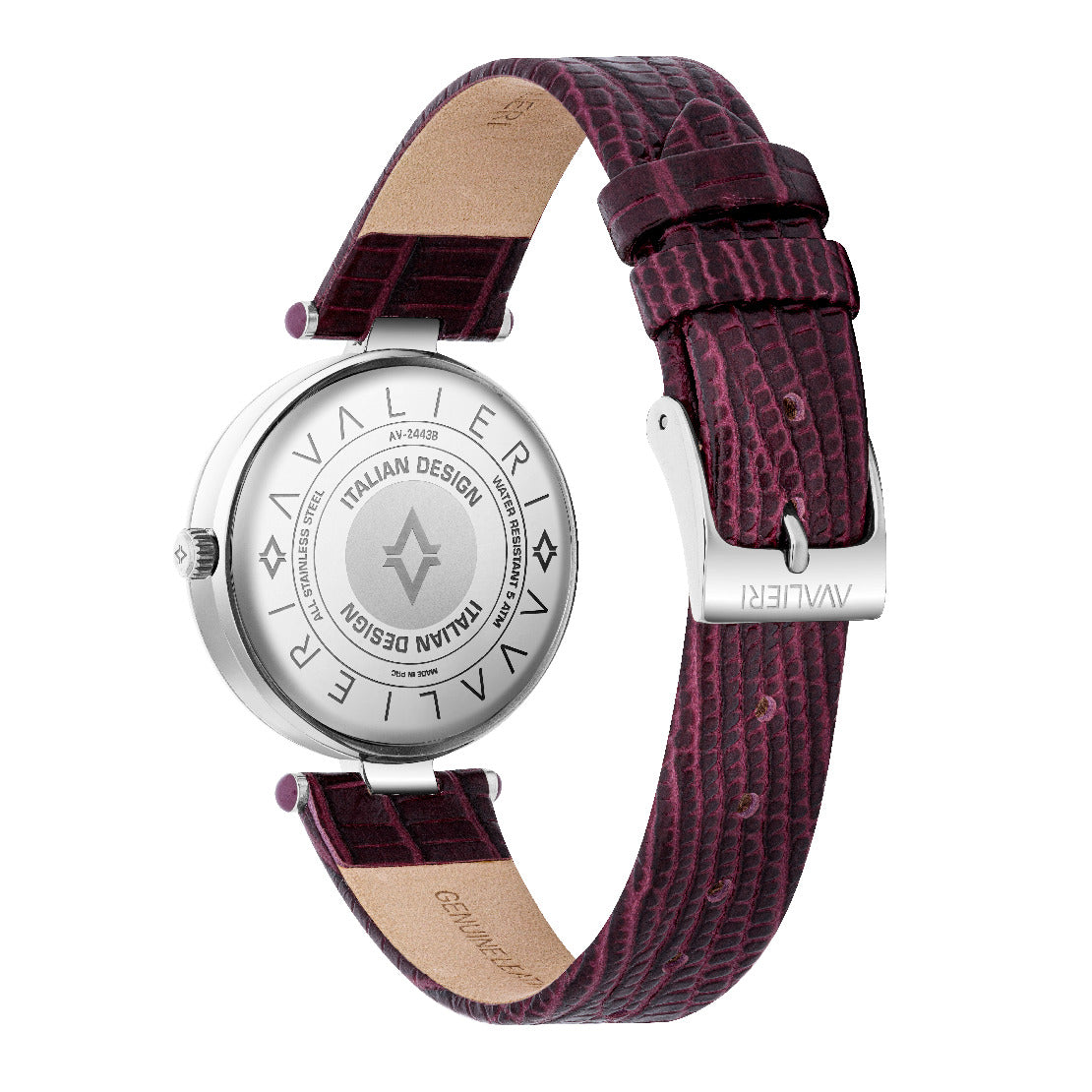 تتميز هذه الساعة من أفاليري باللون البنفسجي وبسوار ذات جودة عالية مصنوعة من الجلد وهيكل مصنوع من الفولاذ المقاوم للصدأ (ستانلس ستيل) بمقاس 32ملم وبسمك 7.8ملم محمي بطبقة من الزجاج المعدني القوي وبحركة كوارتز الموثوقة ولدى الساعة مقاومة ضد الماء حتى 30 متر