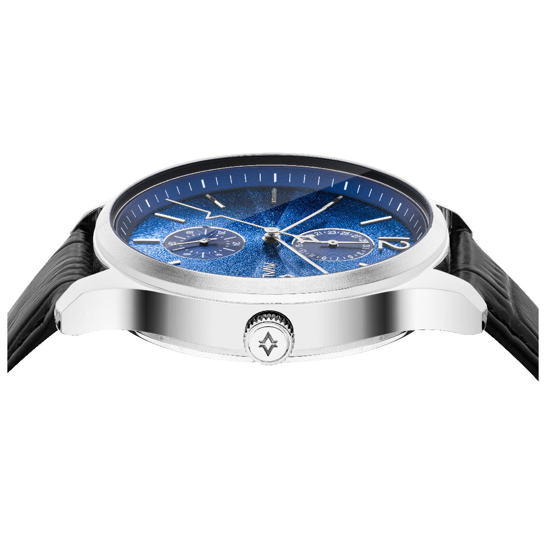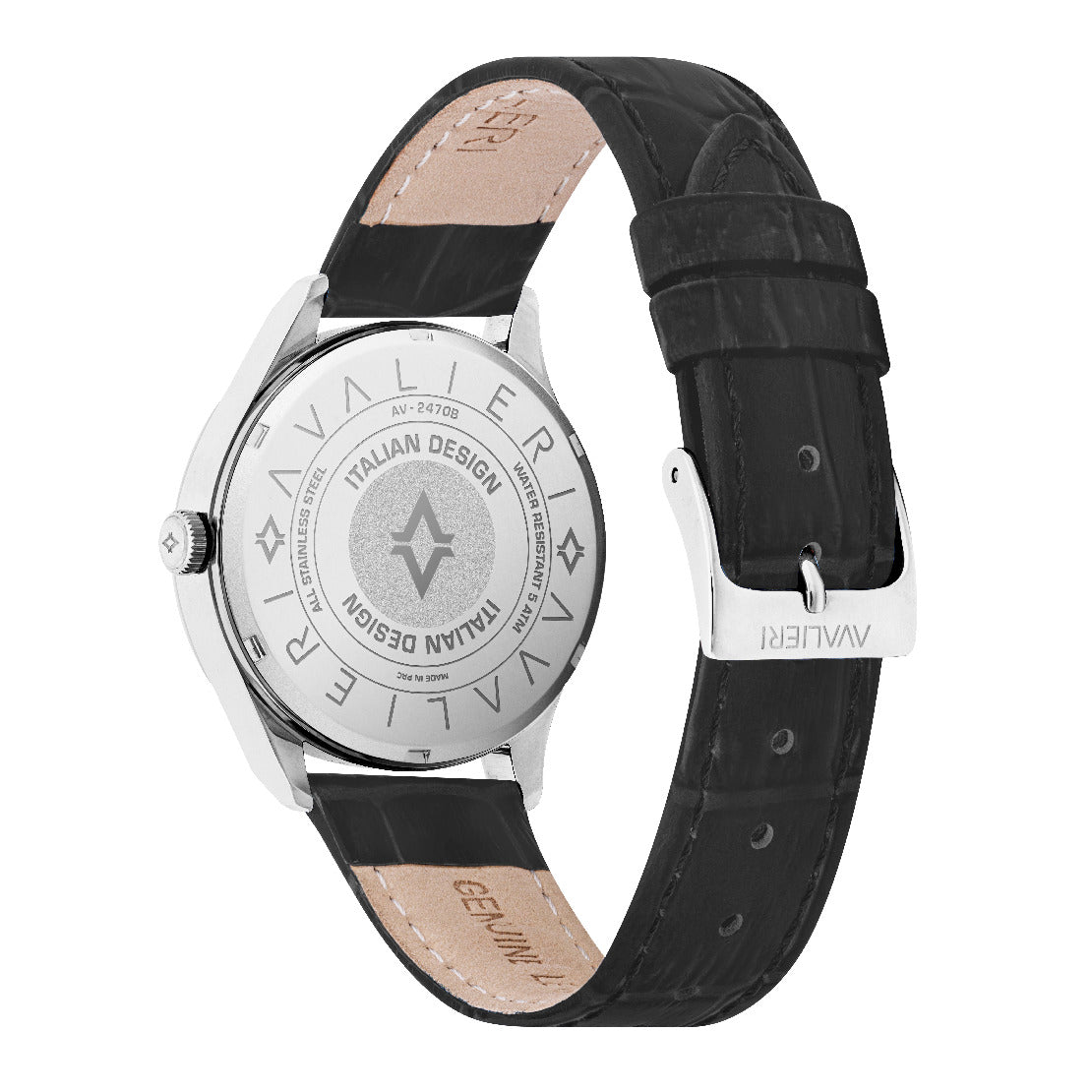 تتميز هذه الساعة من أفاليري باللون الأسود وبسوار ذات جودة عالية مصنوعة من الجلد وهيكل مصنوع من الفولاذ المقاوم للصدأ (ستانلس ستيل) بمقاس 40ملم وبسمك 9.9ملم محمي بطبقة من الزجاج المعدني القوي وبحركة كوارتز الموثوقة ولدى الساعة مقاومة ضد الماء حتى 50 متر