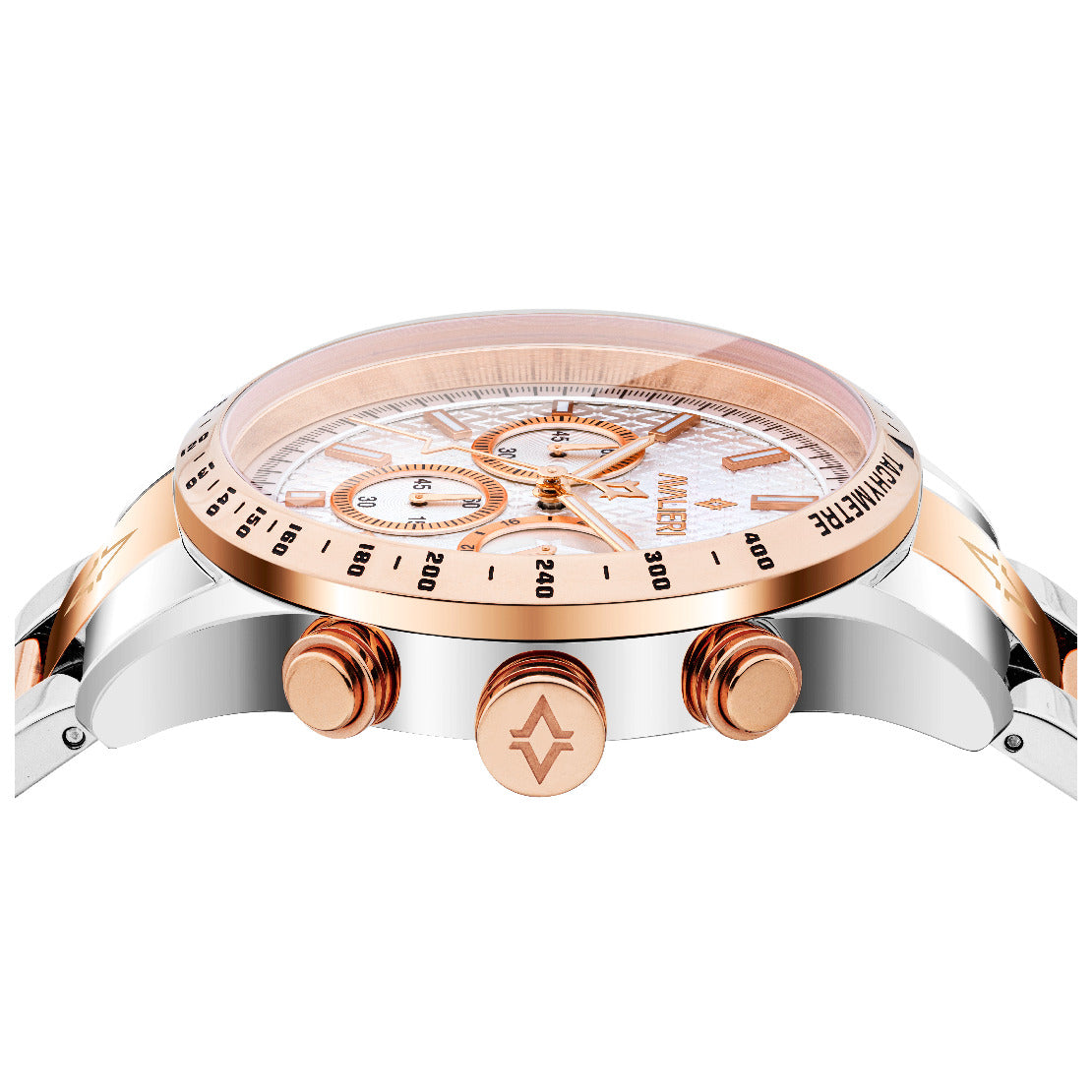 تتميز هذه الساعة من أفاليري باللون الذهبي وردي (روز جولد) وفضي وبسوار ذات جودة عالية مصنوعة من الفولاذ المقاوم للصدأ (ستانلس ستيل) وهيكل مصنوع من الفولاذ المقاوم للصدأ (ستانلس ستيل) بمقاس 44ملم وبسمك 11.2ملم محمي بطبقة من الزجاج المعدني القوي وبحركة كوارتز الموثوقة ولدى الساعة مقاومة ضد الماء حتى 50 متر