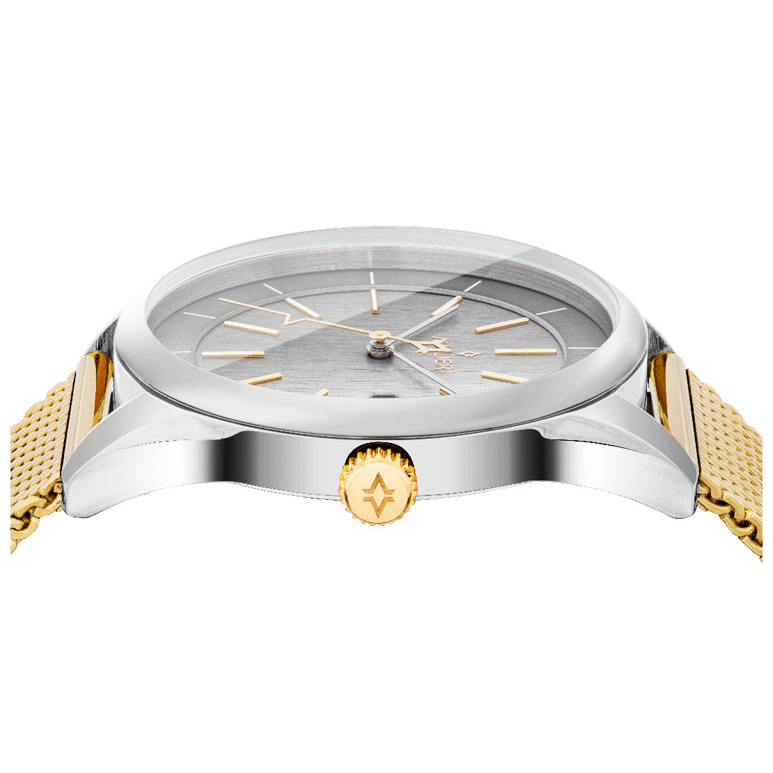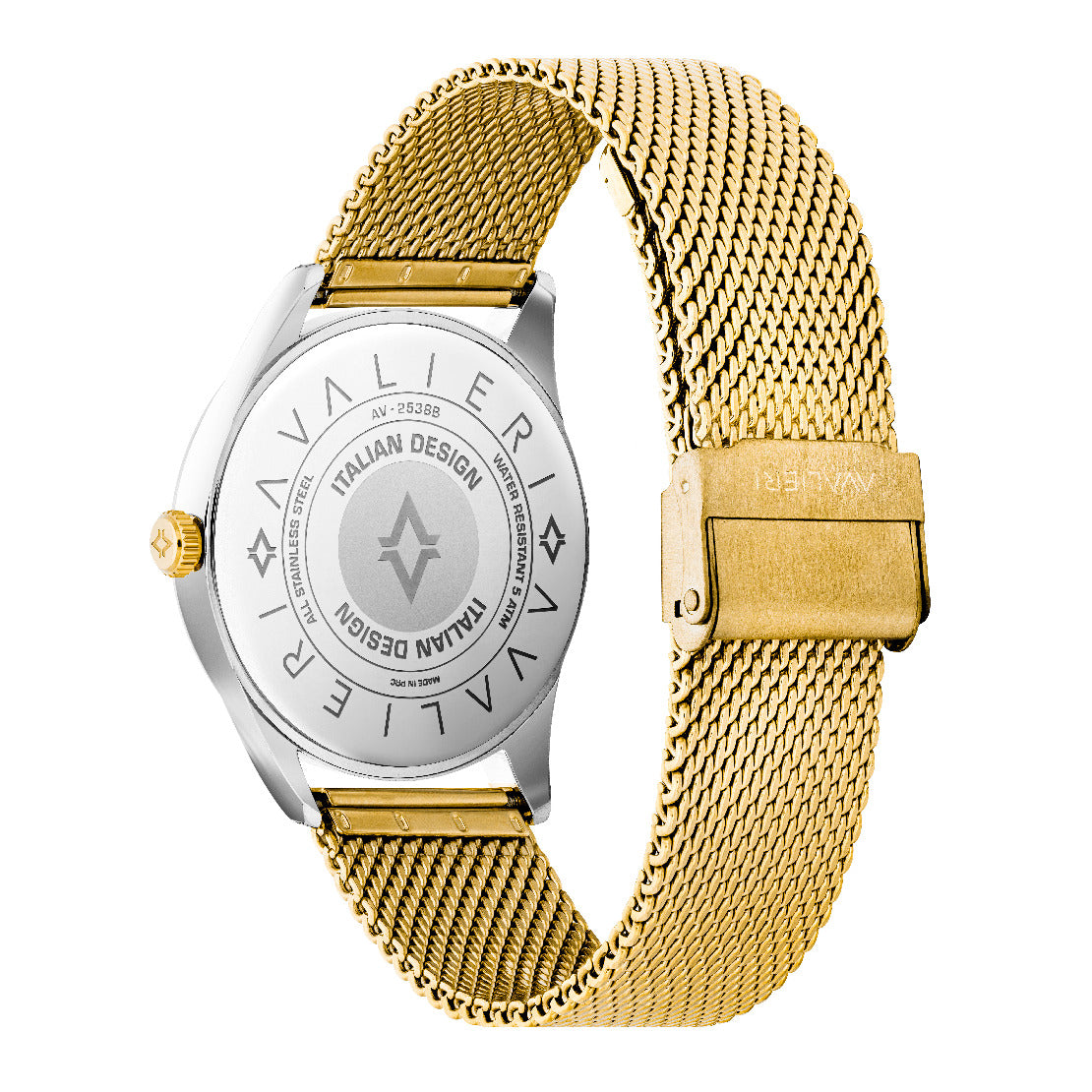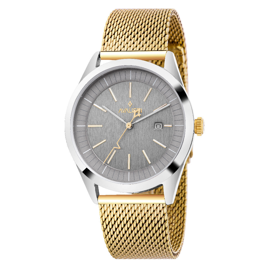 تتميز هذه الساعة من أفاليري باللون الذهبي وبسوار ذات جودة عالية مصنوعة من الفولاذ المقاوم للصدأ (ستانلس ستيل) وهيكل مصنوع من الفولاذ المقاوم للصدأ (ستانلس ستيل) بمقاس 42ملم وبسمك 9.75ملم محمي بطبقة من الزجاج المعدني القوي وبحركة كوارتز الموثوقة ولدى الساعة مقاومة ضد الماء حتى 50 متر
