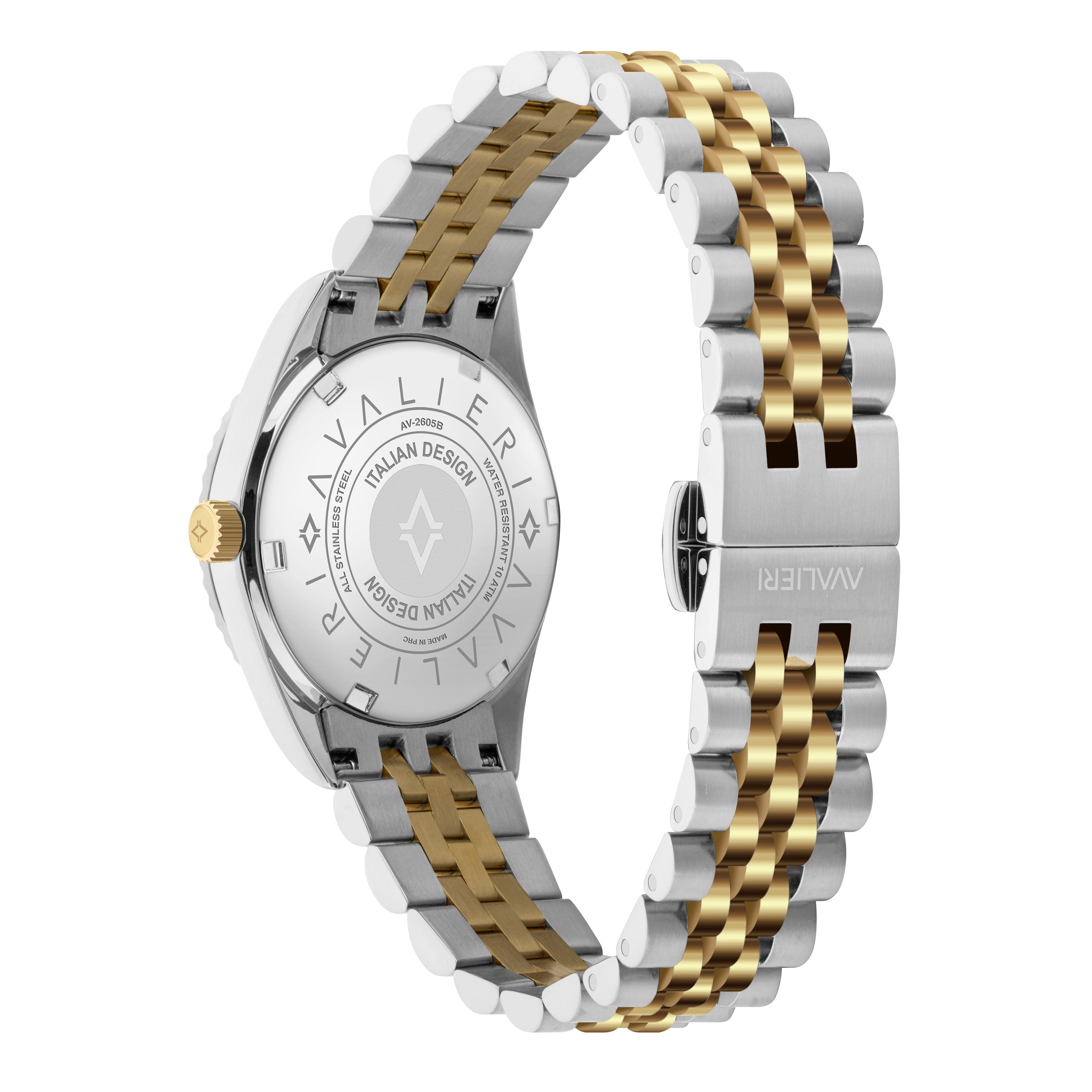 تتميز هذه الساعة من أفاليري باللون الفضي وذهبي وبسوار ذات جودة عالية مصنوعة من الفولاذ المقاوم للصدأ (ستانلس ستيل) وهيكل مصنوع من الفولاذ المقاوم للصدأ (ستانلس ستيل) بمقاس 31ملم وبسمك 5.3ملم محمي بطبقة من الزجاج المعدني القوي وبحركة كوارتز الموثوقة ولدى الساعة مقاومة ضد الماء حتى 100 متر