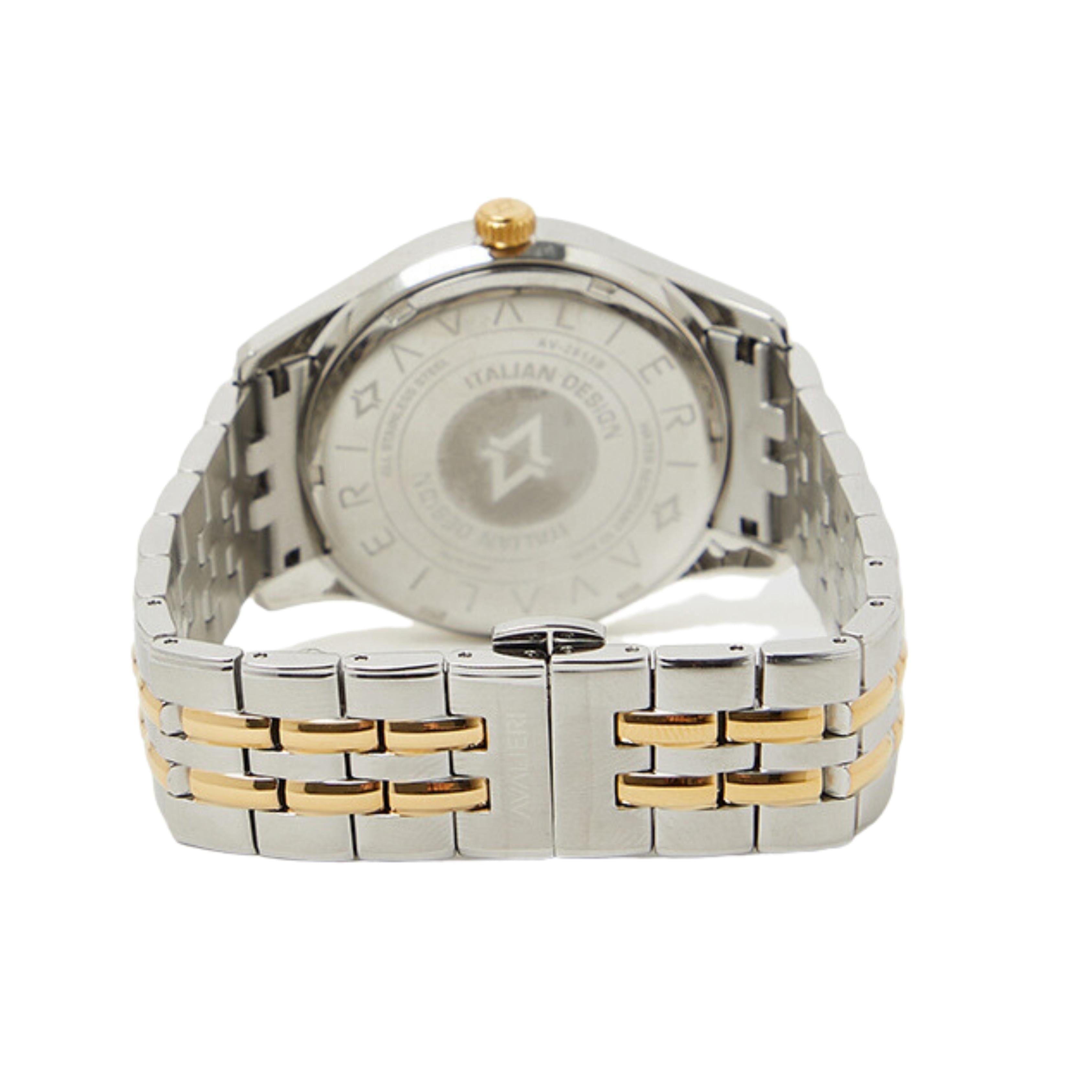 تتميز هذه الساعة من أفاليري باللون الفضي وذهبي وبسوار ذات جودة عالية مصنوعة من الفولاذ المقاوم للصدأ (ستانلس ستيل) وهيكل مصنوع من الفولاذ المقاوم للصدأ (ستانلس ستيل) بمقاس 40ملم وبسمك 7.95ملم محمي بطبقة من الزجاج المعدني القوي وبحركة كوارتز الموثوقة ولدى الساعة مقاومة ضد الماء حتى 100 متر