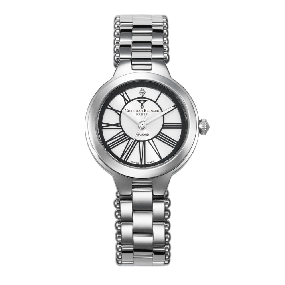 ساعة كريستيان برنارد النسائية بحركة كوارتز ولون مينا فضي - CB-0015(1/D0.01CT)
