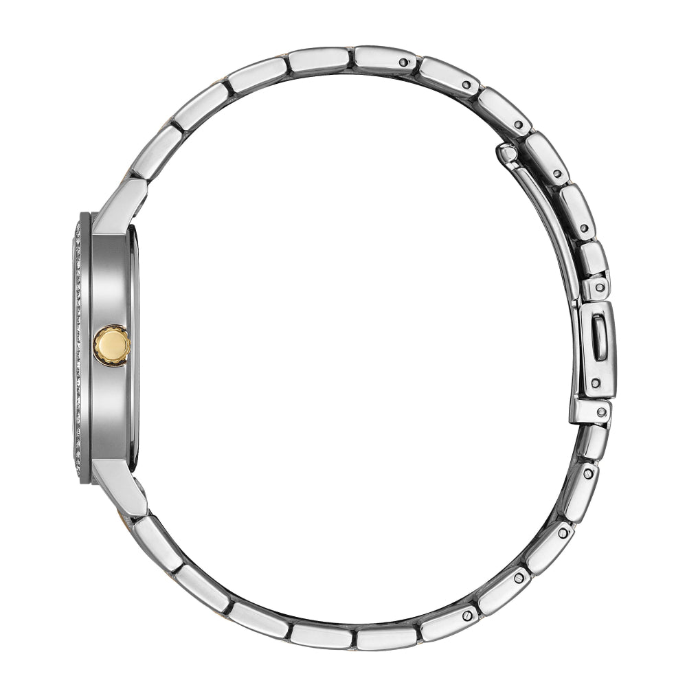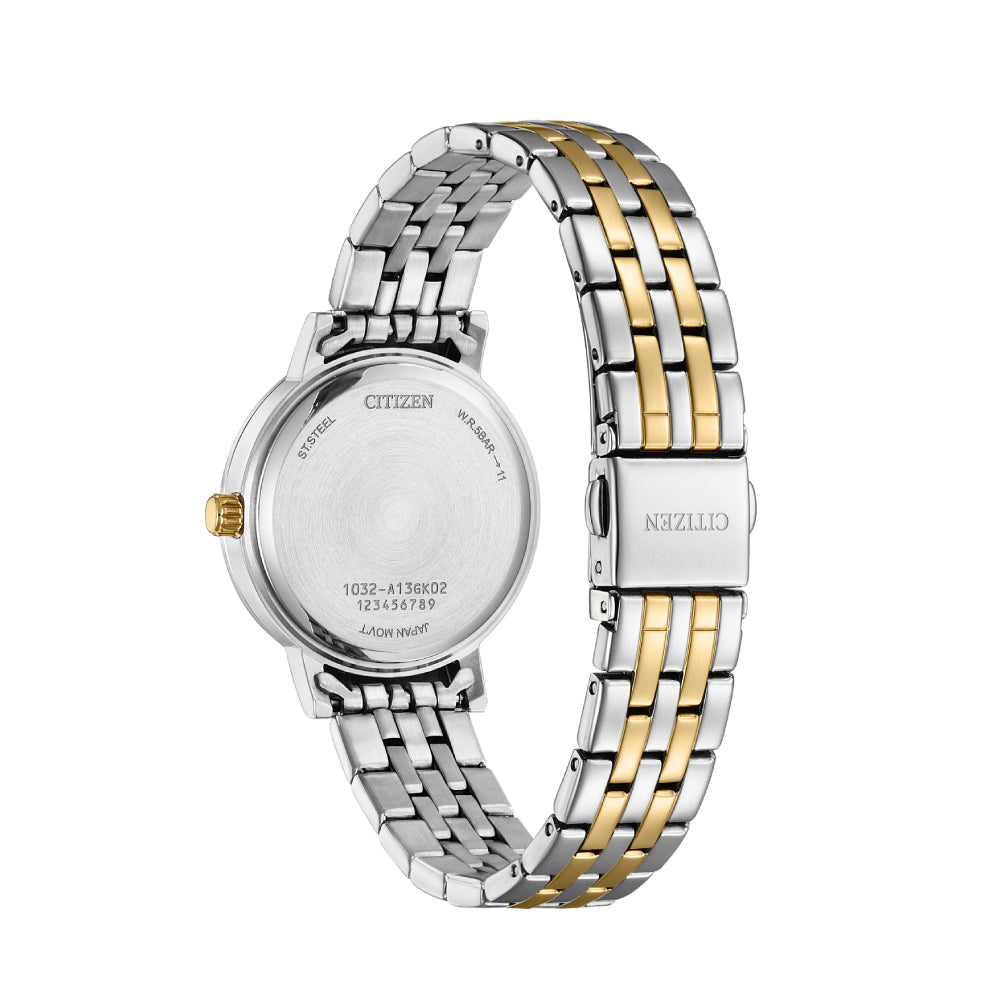 تتميز هذه الساعة من سيتيزن باللون الفضي وذهبي وبسوار ذات جودة عالية مصنوعة من الفولاذ المقاوم للصدأ (ستانلس ستيل) وهيكل مصنوع من الفولاذ المقاوم للصدأ (ستانلس ستيل) بمقاس 31ملم وبسمك 10ملم محمي بطبقة من الزجاج المعدني القوي وبحركة كوارتز الموثوقة ولدى الساعة مقاومة ضد الماء حتى 50 متر