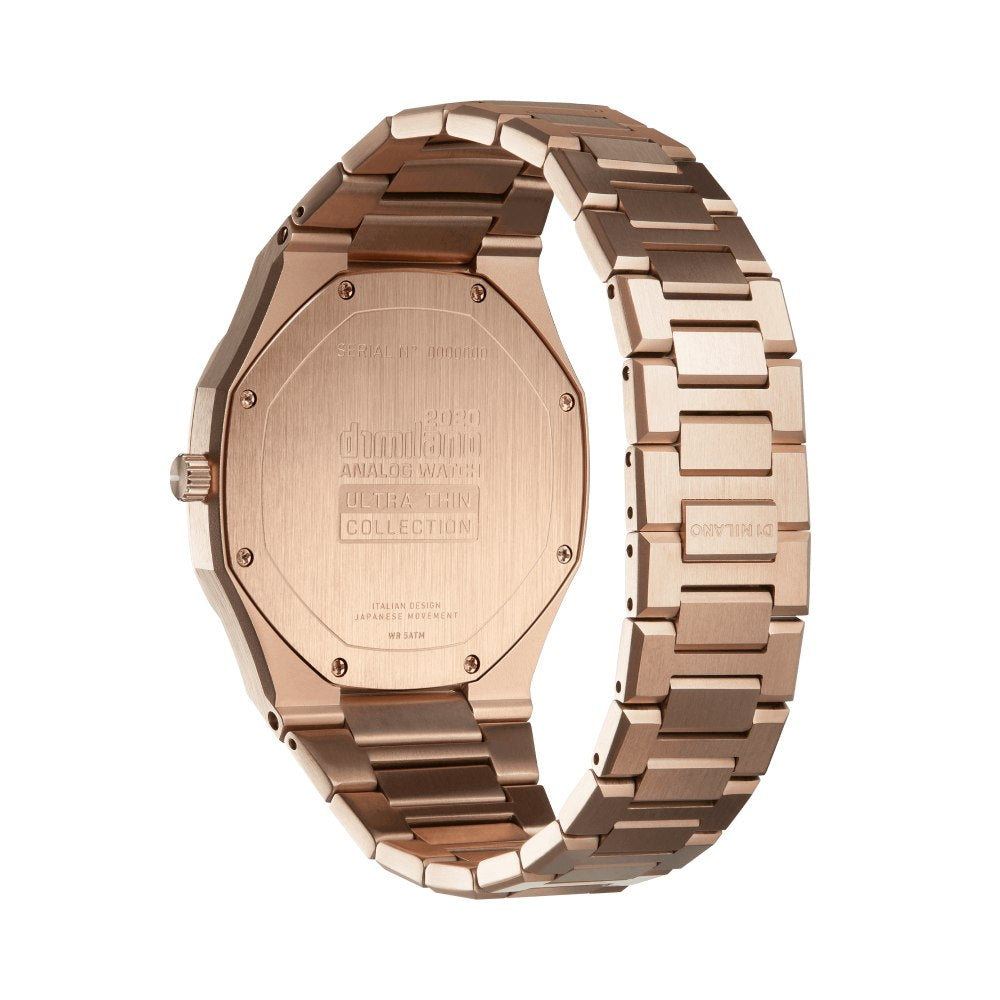 تتميز هذه الساعة من دي وان ميلانو باللون الذهبي وردي (روز جولد) وبسوار ذات جودة عالية مصنوعة من الفولاذ المقاوم للصدأ (ستانلس ستيل) وهيكل مصنوع من الفولاذ المقاوم للصدأ (ستانلس ستيل) بمقاس 40ملم وبسمك 6ملم محمي بطبقة من الزجاج الياقوت القوي وبحركة كوارتز الموثوقة ولدى الساعة مقاومة ضد الماء حتى 50 متر