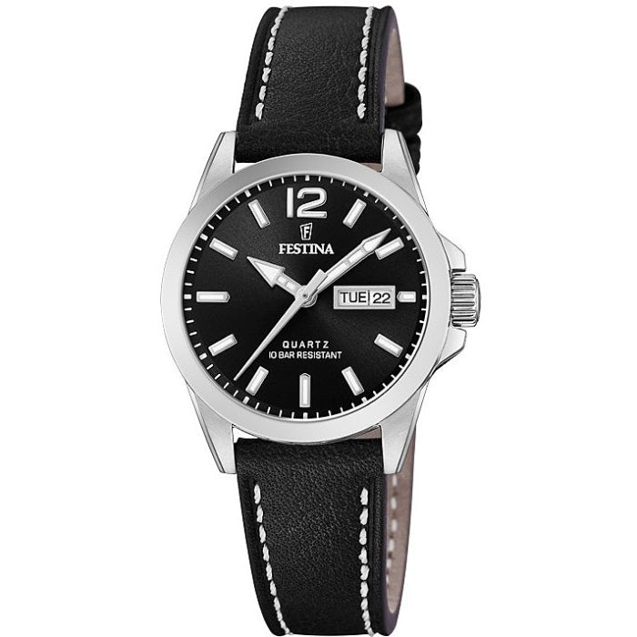 تتميز هذه الساعة من فيستينا باللون الأسود وبسوار ذات جودة عالية مصنوعة من الجلد وهيكل مصنوع من الفولاذ المقاوم للصدأ (ستانلس ستيل) بمقاس 30ملم وبسمك 9ملم محمي بطبقة من الزجاج المعدني القوي وبحركة كوارتز الموثوقة ولدى الساعة مقاومة ضد الماء حتى 100 متر
