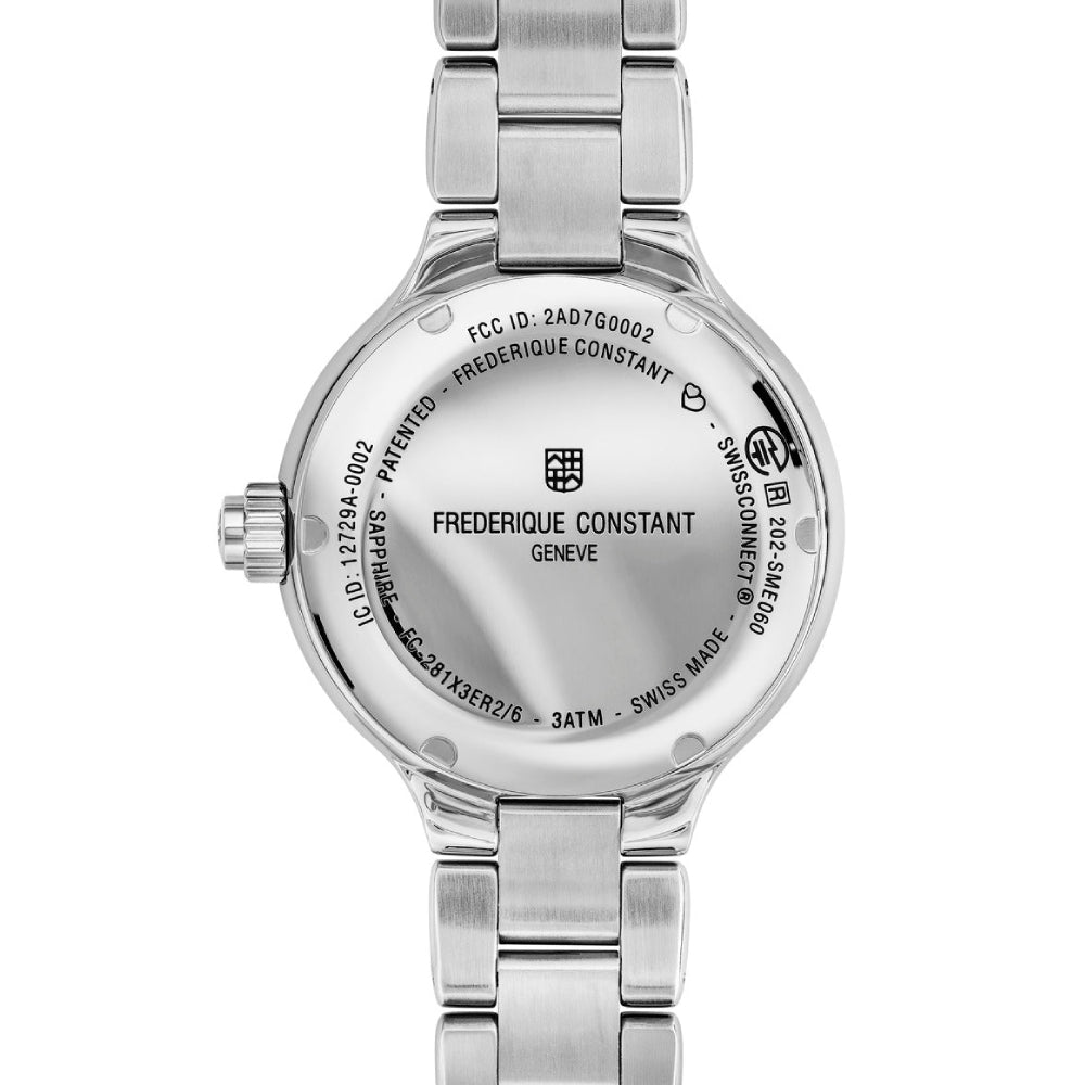 تتميز هذه الساعة من فريدريك كونستانت باللون الفضي وبسوار ذات جودة عالية مصنوعة من الفولاذ المقاوم للصدأ (ستانلس ستيل) وهيكل مصنوع من الفولاذ المقاوم للصدأ (ستانلس ستيل) بمقاس 34ملم وبسمك 11ملم محمي بطبقة من الزجاج الياقوت القوي وبحركة كوارتز الموثوقة ولدى الساعة مقاومة ضد الماء حتى 30 متر