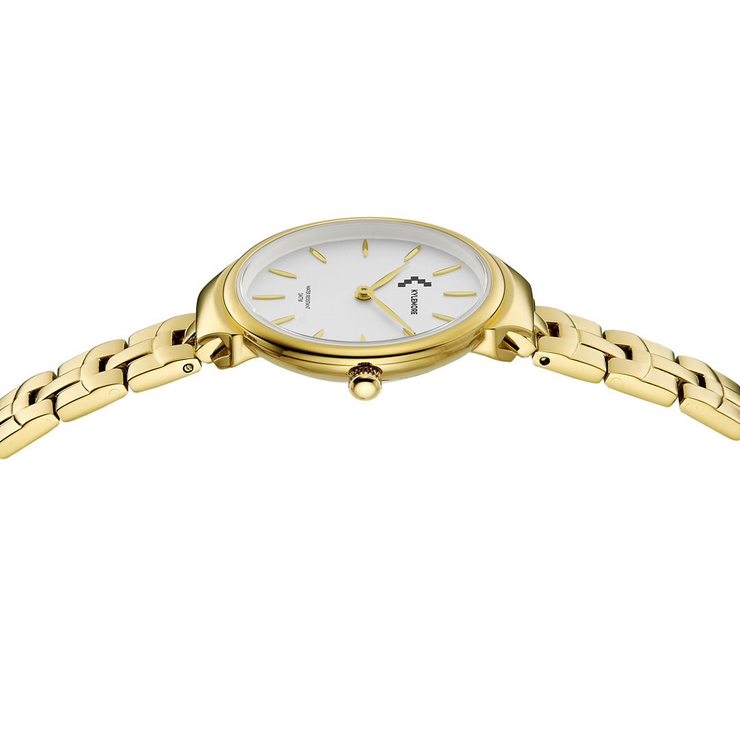تتميز هذه الساعة من كيليمور باللون الذهبي وبسوار ذات جودة عالية مصنوعة من الفولاذ المقاوم للصدأ (ستانلس ستيل) وهيكل مصنوع من الفولاذ المقاوم للصدأ (ستانلس ستيل) بمقاس 30ملم محمي بطبقة من الزجاج المعدني القوي وبحركة كوارتز الموثوقة