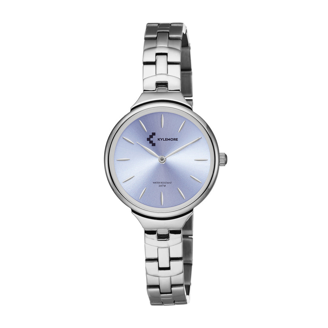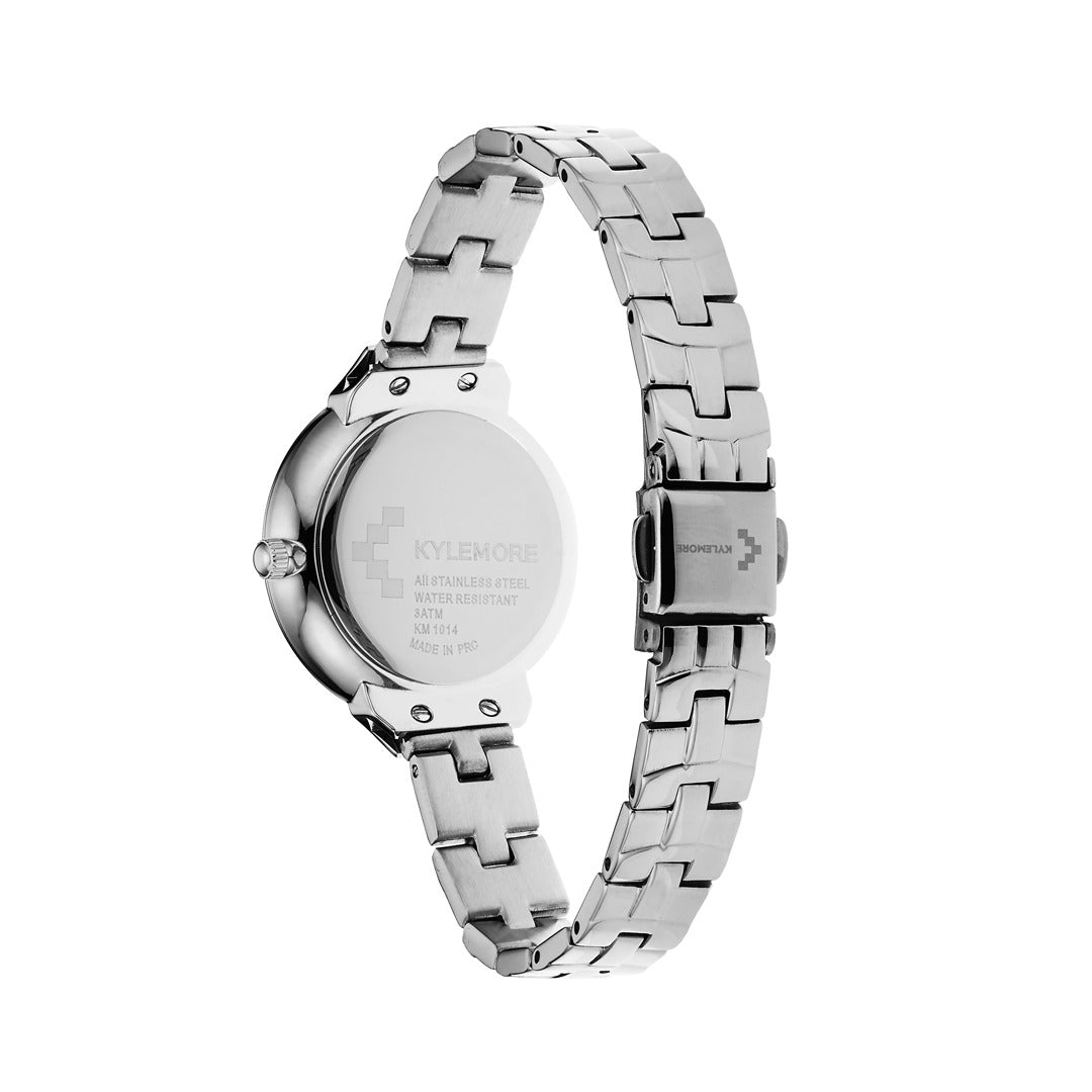 تتميز هذه الساعة من كيليمور باللون الفضي وبسوار ذات جودة عالية مصنوعة من الفولاذ المقاوم للصدأ (ستانلس ستيل) وهيكل مصنوع من الفولاذ المقاوم للصدأ (ستانلس ستيل) بمقاس 30ملم محمي بطبقة من الزجاج المعدني القوي وبحركة كوارتز الموثوقة