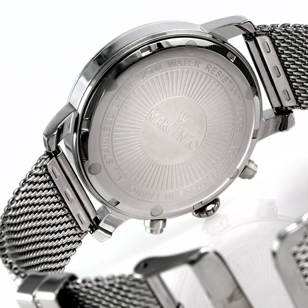 تتميز هذه الساعة من مارك انزو باللون الفضي وبسوار ذات جودة عالية مصنوعة من الفولاذ مقاوم للصدأ (ستانلس ستيل) شبكي وهيكل مصنوع من الفولاذ مقاوم للصدأ (ستانلس ستيل) بمقاس 41ملم وبسمك 10.7ملم محمي بطبقة من الزجاج المعدني القوي وبحركة كوارتز الموثوقة ولدى الساعة مقاومة ضد الماء حتى 50 متر